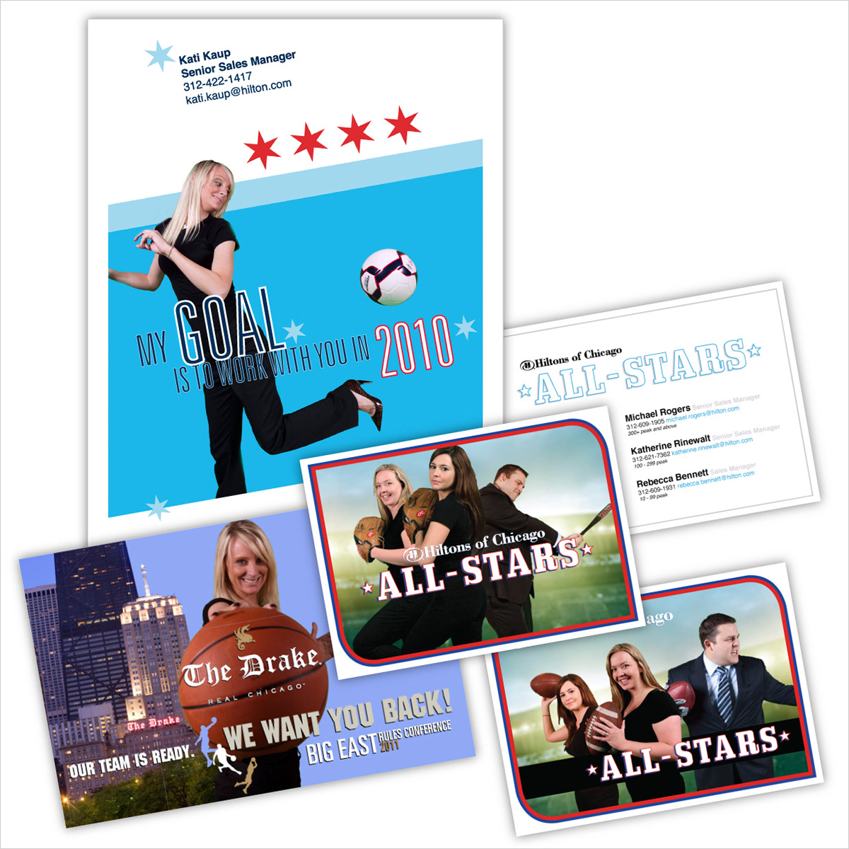 2009, clockwise from top L: 7.5" x 10" printed flyer & email, 2.5" x 3.5" printed trading cards, 8.5" x 5.5" printed postcard